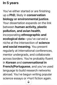 Ok, now that these caveats are out of the way, I come to my original conclusion. The fact that ChatGPT could forecast the same future I would forecast for myself assures me that I am taking the necessary steps now to build that future for myself. A future where I become an interdisciplinary-minded, multi-cultural avian ecologist, who also happens to be a master of capoeira. (I’ve come a long way since last year when I faced deep uncertainty about which path to take.)